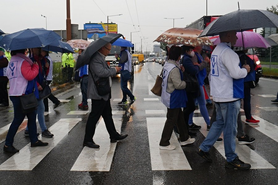 Galéria k článku Odborári zablokovali cestu v Žiline: Štrajkujúcich neodradil ani dážď, VIDEO