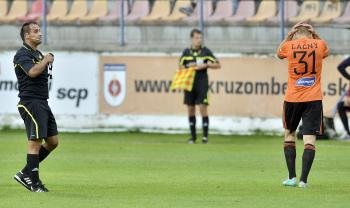 Rozhodca Štefan Leško (vľavo) a práve vylúčený útočník Ružomberka Miloš Lačný