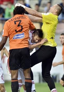 Stredopoliar Ružomberka Tawamba Kana (vľavo), obranca Trnavy Martin Klabník (uprostred) a brankár Trnavy Miroslav Filipko