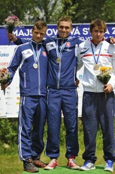 Medailisti v single kajaku K1, Slováci zlatý Jakub Grigar (v strede), strieborný Andrej Málek (vpravo) a Francúz Bastien Damiens