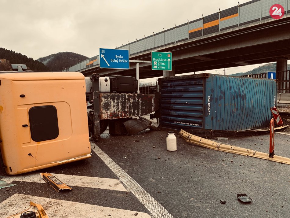 Galéria k článku Prevrátený kamión v Strážove: Nehoda zablokovala ťah na Žilinu, FOTO