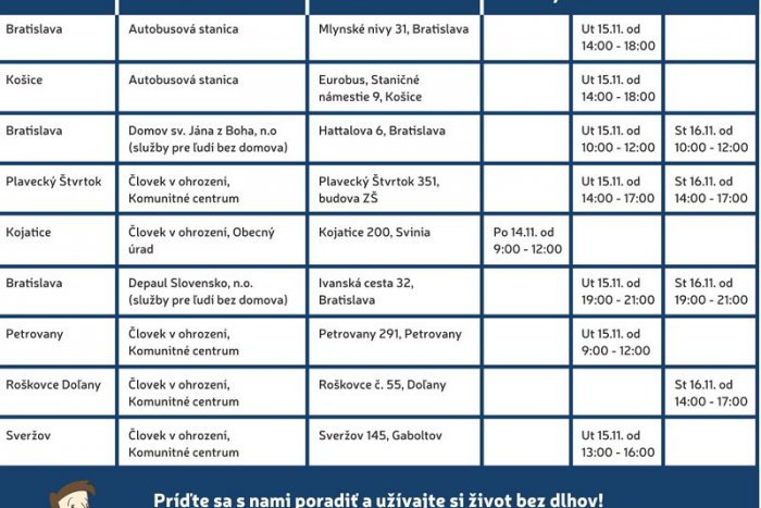 Odborní poradcovia budú k dispozícii na deviatich kontaktných miestach po celom Slovensku – v komunitných centrách Človeka v ohrození, v zariadeniach neziskových organizácií: Depaul Slovensko a Domov sv. Jána z Boha ako aj na autobusových staniciach v Bratislave a v Košiciach. Viac informácií nájdete aj na www.nasedlhy.sk