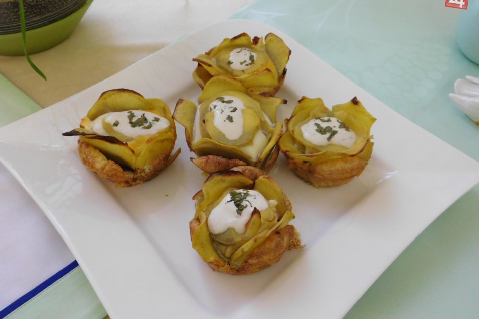 Postup: Na panvičku dáme slaninu narezanú na rezančeky, pridáme cibuľu nakrájanú na polokrúžky, soľ, čierne korenie a surové vajíčko. Mafinovú formu natrieme olejom, naukladáme na plátky narezané zemiaky do tvaru ruže, pridáme pripravenú zmes so surovým vajíčkom. Pridáme plátok syra a na vrch dáme ešte ďalšie zemiaky. Pečieme v rúre na 220 °C.približne 15 minút.