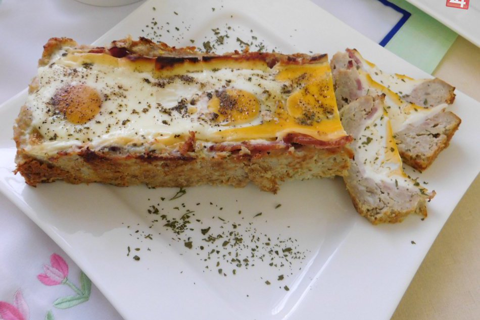 Postup: Mleté mäso, nakrájanú cibuľu, strúhanku, jedno vajce, cesnak, soľ a korenie spojíme do jednej masy. Takto pripravenou mäsovou zmesou obložíme vymastenú obdĺžnikovú formu. Do stredu zmesi natrieme krémový syr, na syr pozdĺžne položíme plátky slaniny a na ne poukladáme plátky eidamu. Na záver na vrch rozbije tri vajíčka ktoré osolíme. Pečieme jednu hodinu pri teplote 180°C.