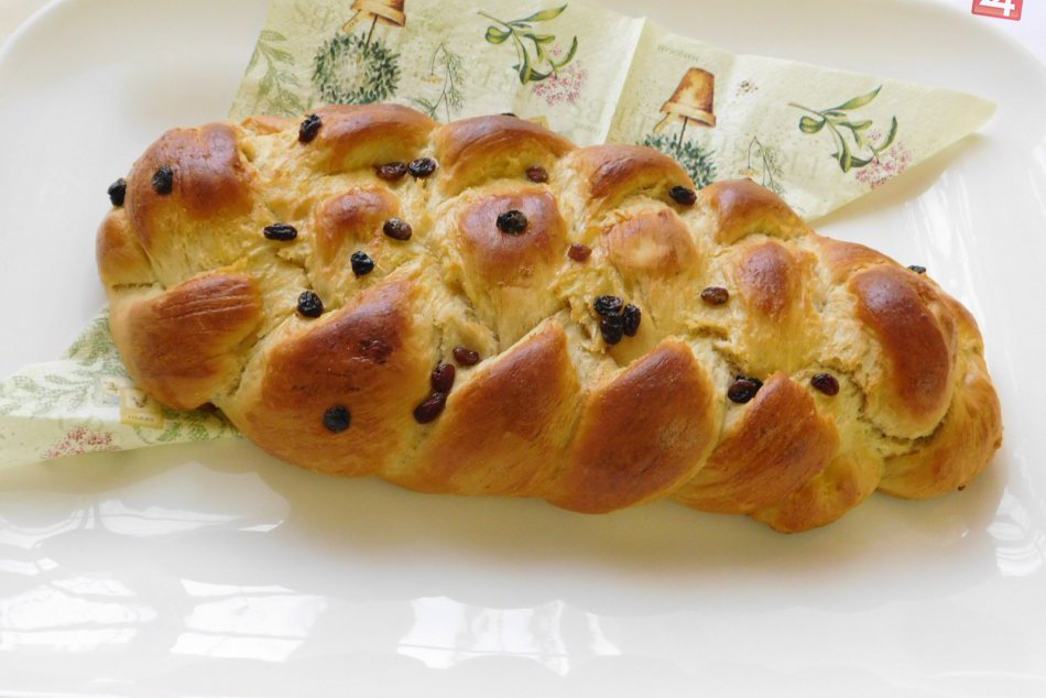 Postup: Všetky suroviny spolu dobre premiešame. Cesto necháme pol hodinku vykysnúť. Potom si ho rozrežeme na štyri rovnaké pásy, vyvaľkáme a zapletieme vianočku. Ozdobíme hrozienkami. Pred pečením vianočku natrieme žĺtkom a pečieme v rúre pri 180 stupňoch približne pol hodinu.