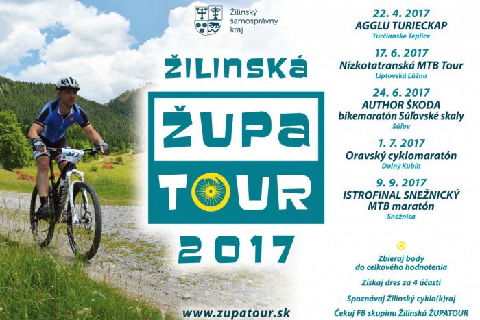 Žilinská ŽUPATOUR odštartuje rok 2017 koncom apríla v Turčianskych Tepliciach na AGGLU TURIECKAPe. „Po malej prestávke pretekári v polovici júna vyrazia na Nízkotatranskú MTB Tour v Liptovskej Lúžnej a následne cykloséria zamieri na populárny AUTHOR ŠKODA Bikemaratón Súľovské skaly, kde sa v minulom roku aj napriek vysokým horúčavám zúčastnil rekordný počet cyklistov,“ informoval koordinátor Žilinskej ŽUPATOUR Slavomír Strečanský s tým, že v Súľove štartovalo viac ako tisíc župných cyklistov. Letné prázdniny začnú Oravským cyklomaratónom v Dolnom Kubíne a sériu zakončí v septembri ISTROFINAL SNEŽNICKÝ MTB maratón v Snežnici. „Preteky sú pre nadšencov všetkých vekových kategórií, v prvom ročníku sme mali päťročného, ale aj 76-ročného cyklistu, takže zúčastniť sa môže každý, kto má chuť šliapnuť do pedálov a spoznať Žilinský kraj,“ dodal S. Strečanský.