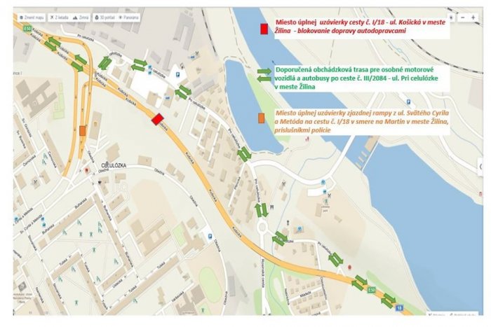 Žilinská krajská polícia na svojom oficiálnom facebooku upozorňuje vodičov, že do 20:00 hod. bude úplne uzatvorená cesta I/18 na Košickej v oboch smeroch za križovatkou s ulicou sv. Cyrila a Metoda (zjazdná rampa z ulice sv. Cyrila a Metoda zo sídliska Vlčince v smere na Martin) – prejazd bude umožnený výhradne vozidlám všetkých záchranných zložiek.